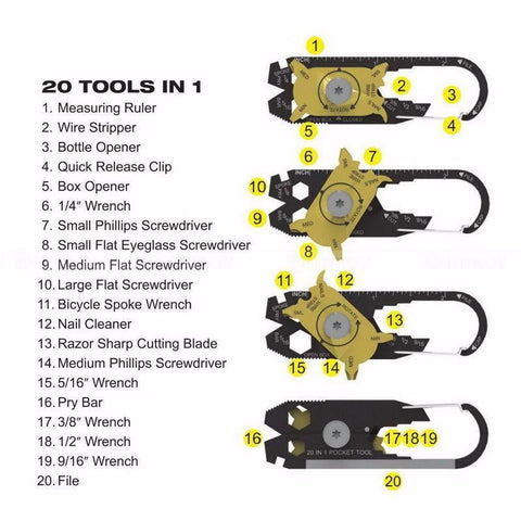 Clips to anything and is always ready for use, with the most useful array of tools possible within such a small space. The rotating tool plate serves to protect and keep all the tools safe when the tool is not in use, or simply twists with a push of your thumb on its sprung bearings to click definitively into set positions to use the driver bits, nail cleaner, extra sockets, razor sharp cutter and wire stripper.