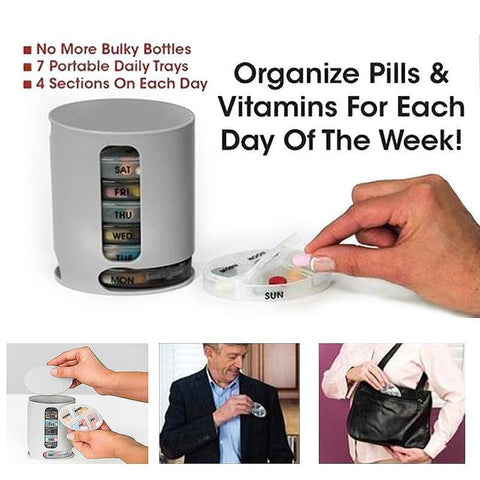 Organize Your Pills and Vitamins! Take the guesswork out of taking medication! Pill Pro organizer has seven portable trays, each with four labeled compartments to coordinate pills and vitamins by time of day. Never miss a dosage – every pill has its place for the entire week. Easily slide out the tray you need for the day and the next day's tray automatically drops into place. Once your done with the tray, fill it back up with your pills and vitamins, remove the cover and drop in back in.